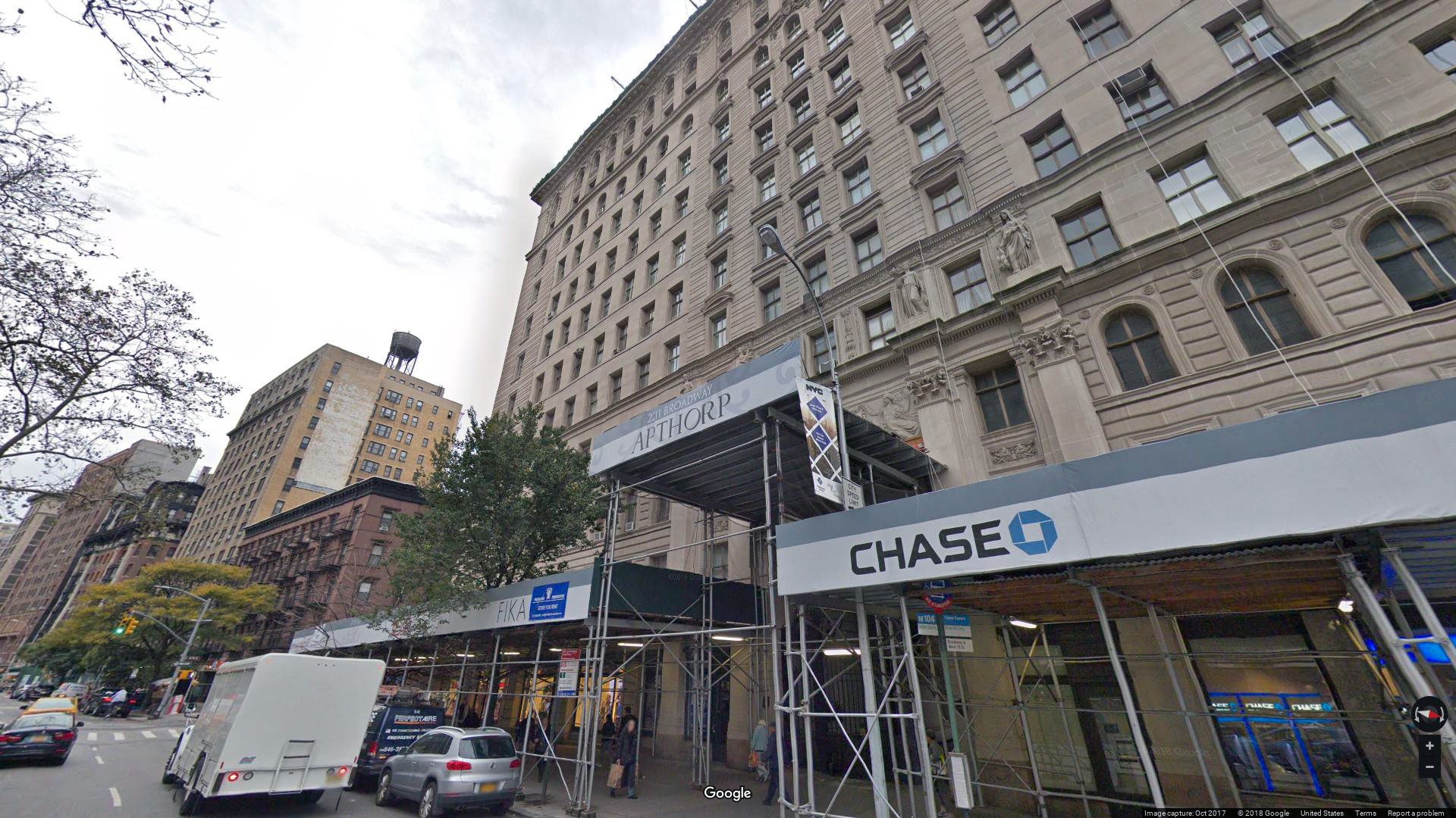 Originally constructed as a residential hotel, The Apthorp was named after the Apthorp Farm, which once occupied the site. It features a limestone facade divided into three horizontal sections, with monumental arched courtyard entrances flanked by paired Corinthian pilasters. The building was designated a New York City landmark and is listed on the National Register of Historic Places.
