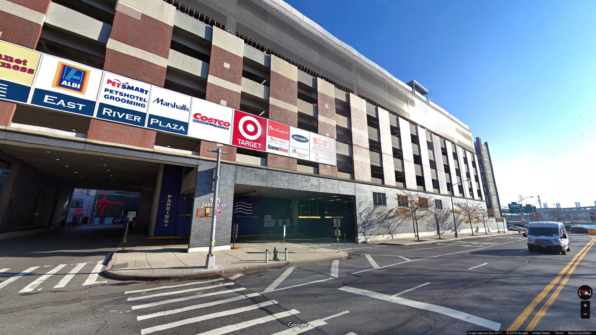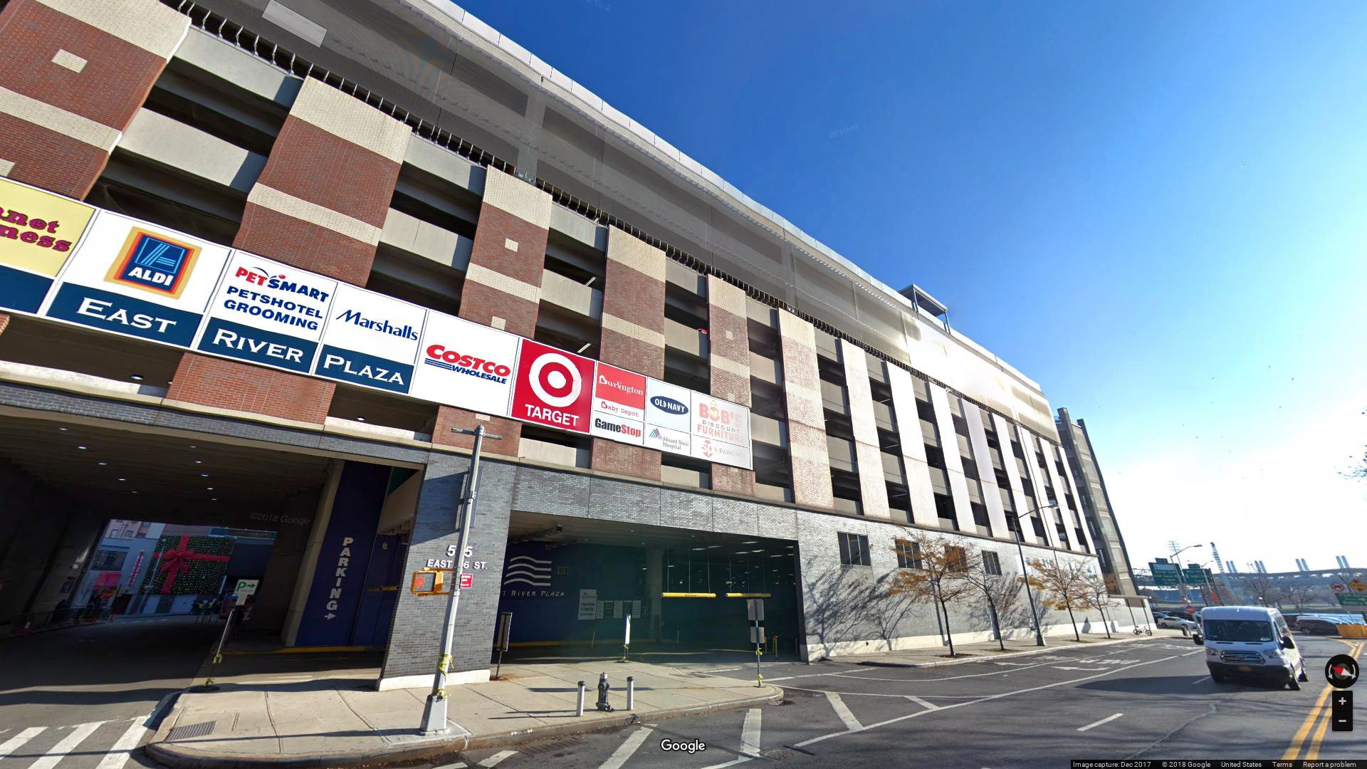 The East River Plaza Skyway itself is a notable landmark in the area, providing essential parking services to the surrounding businesses and residents.